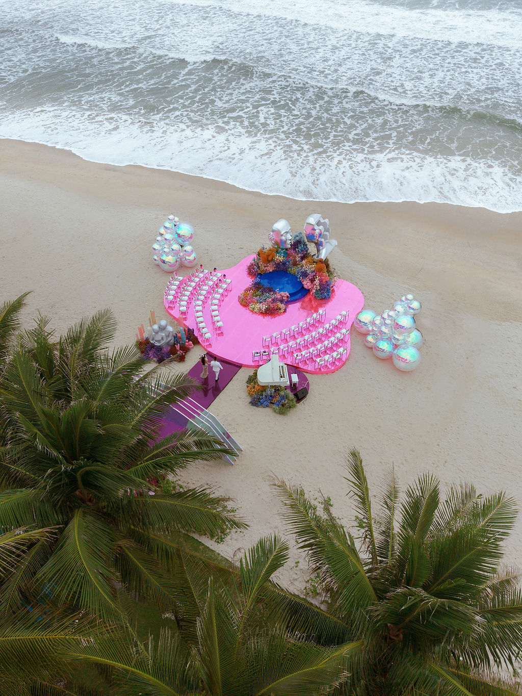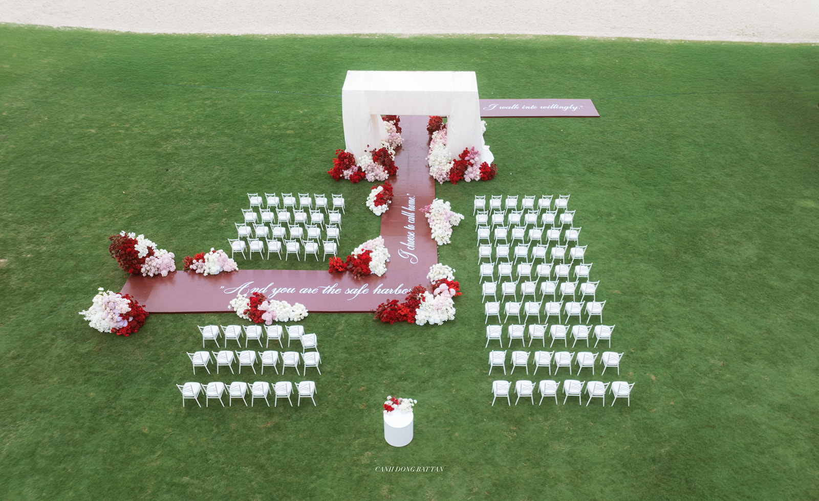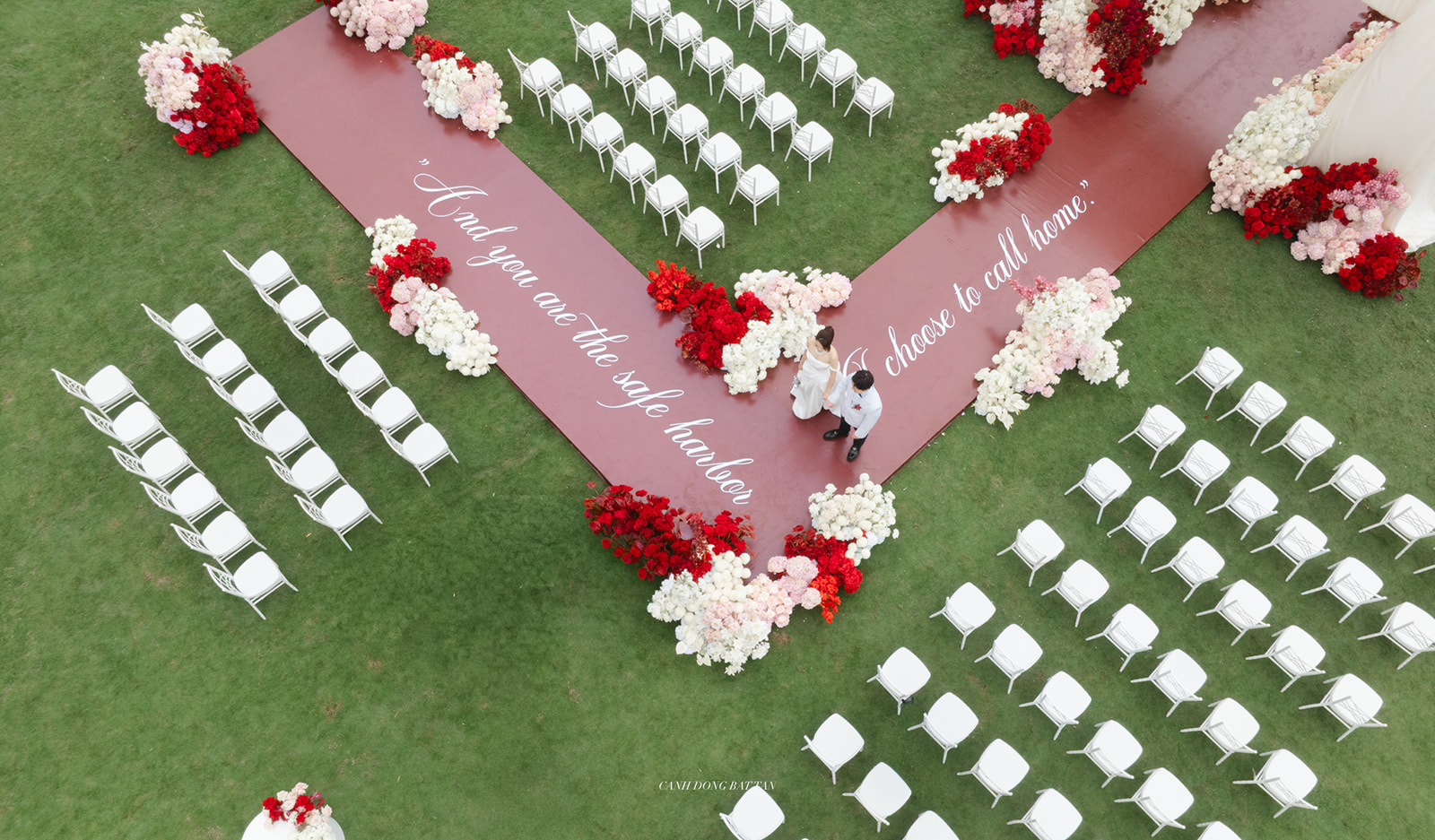 Rather than a straight walkway, the ceremony space is designed so that the stage, aisle, or seating arrangement subtly forms the letters of the couple’s names. When viewed from above – especially through flycam photography – the layout reveals a symbolic monogram, turning the ceremony into a literal signature of their union.