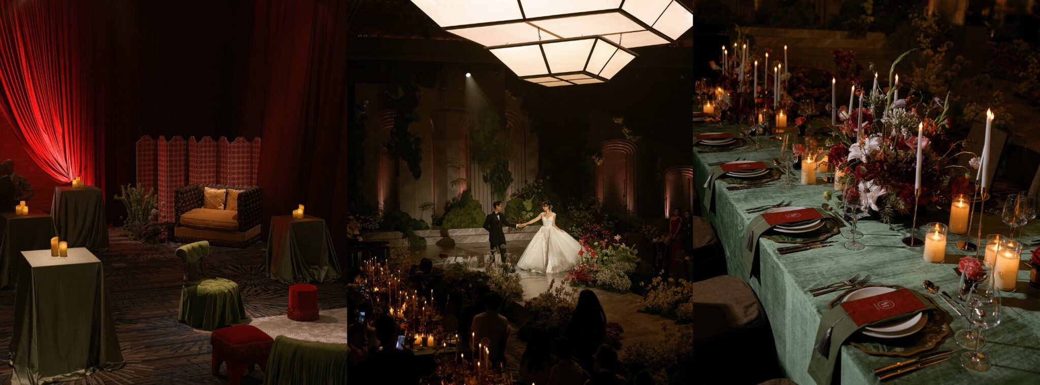 PinSet in a palette of moss green, bordeaux and burgundy, the entire evening was unfold with the nature’s warmth and the richness of heartfelt promises.